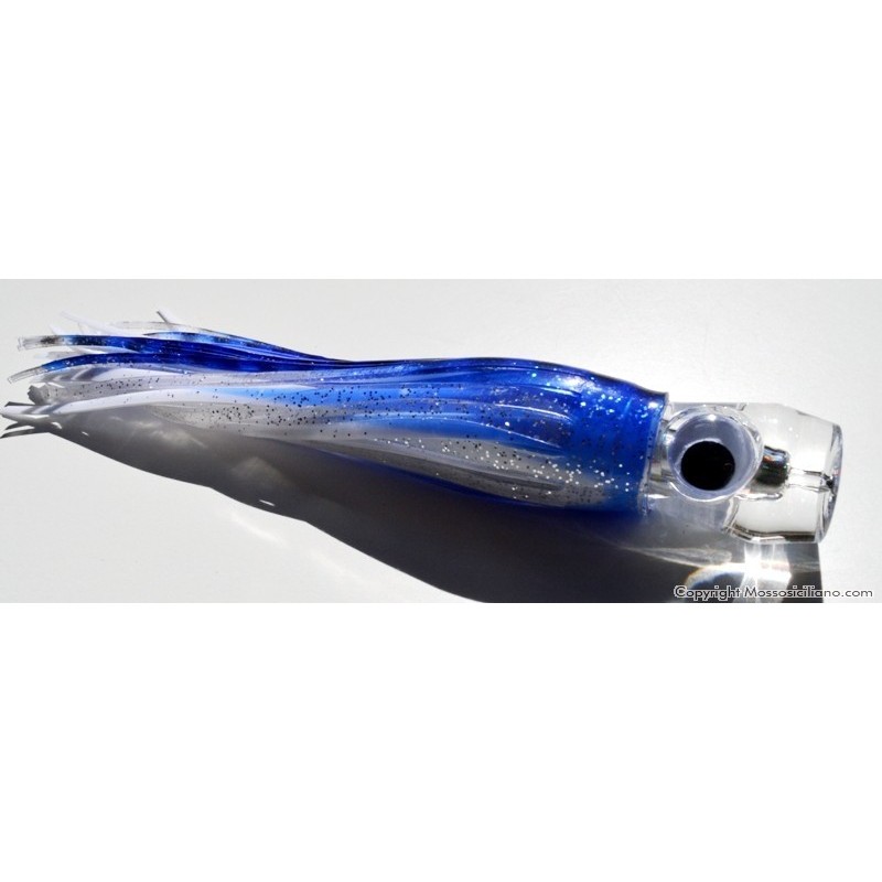 Kona testa resina trasparente c.16 con filamenti fluorescenti alla luce e occhi movibili.Speciale Marlin , bonito , pesce vela, bonefish ,pesce spada ,alalunga.A richiesta montaggio del terminale.